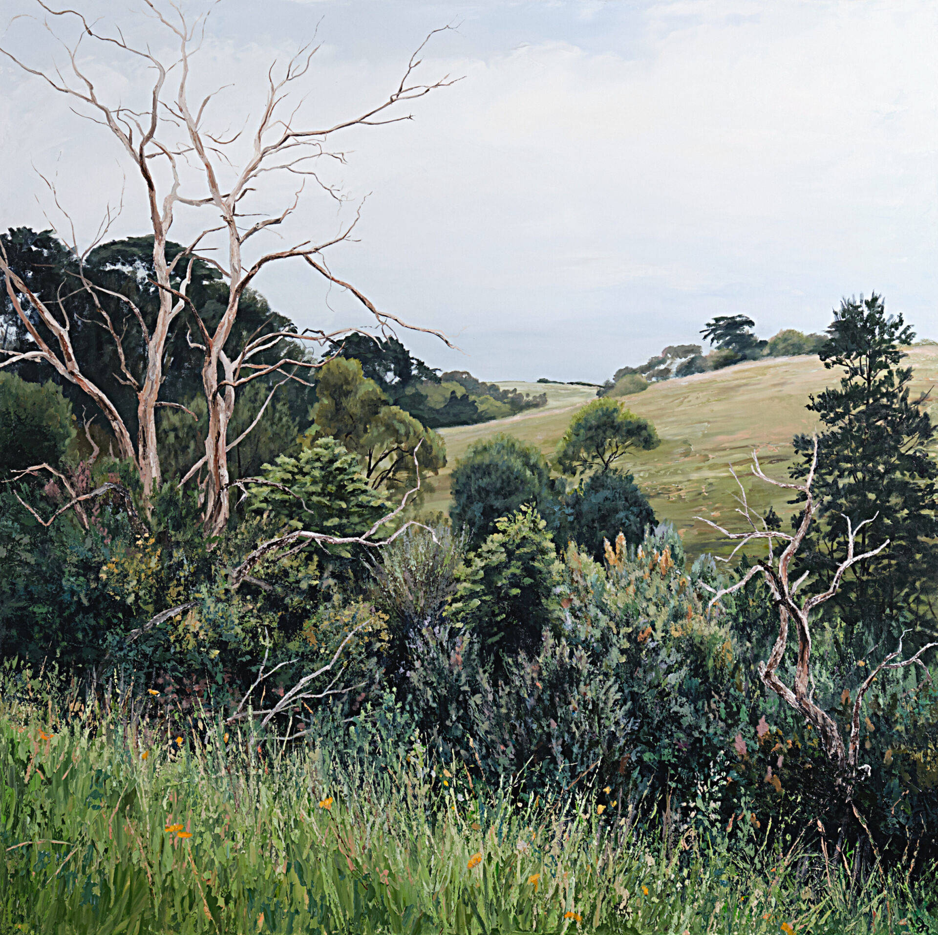 Artist, Jennifer Riddle's painting 'The return to the Valley' 2021, from the 'Lost and Found' solo exhibition, Scott Livesey Galleries, Prahran, Victoria, Australia.